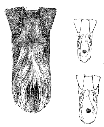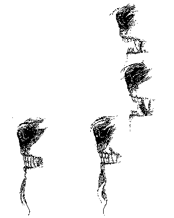 1) Cabeza Correcta. 2) Cráneo incorrecto: ancho entre orejas y mejillas estrechándose.