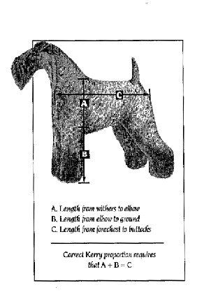 "Moderado o moderadamente" son palabras significativas en el estandar del Kerry indicando una raza moderada en todos los sentidos. Un Kerry jamás debe parecer desproporcionado, todas las partes deben estar equilibradas. La cabeza debe estar proporcionada al cuerpo, el cuello proporcionado a la longitud de la espalda y la espalda deberá estar proporcionada a la altura de los hombros y a la longitud de las patas. "Upstanding" se refiere aquí a la longitud de pata ya que el Kerry es una de las razas de pata larga. La distancia desde la cruz hasta los codos debe ser casi igual a la distancia desde los codos hasta el suelo y la longitud total del perro desde el pecho hasta el islion aproximadamente la misma que su altura a la cruz.